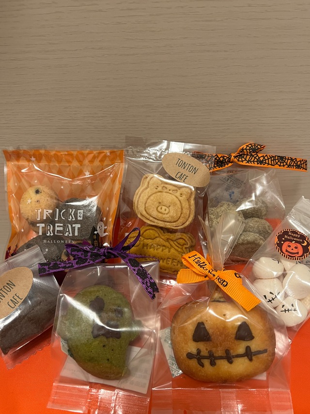 ハロウィン限定の焼き菓子セットです。 おばけやコウモリ、かぼちゃなど、かわいい ハロウィンモチーフのお菓子を、ひとつひとつ丁寧に焼き上げました。 ハロウィン柄の袋やリボンでラッピングして お届けします。 セット内容 • チョコチップクッキー2種類8枚 • 抹茶のおばけマドレーヌ ランダム1個 • バニラのジャックオランタンマドレーヌ 1個 • おばけメレンゲ • コウモリクッキー • ブタさんバニラクッキー 2枚 • かぼちゃクッキー 2枚 販売開始が遅くなってしまったのでハロウィン終わってからの到着になってしまいます、 それでも構わない方のみご購入お願い致します